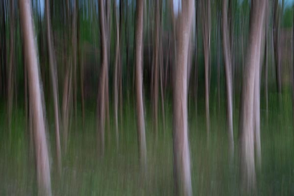 Description: This image captures a forest scene with an intentional camera movement technique, creating a blurred, abstract effect. The vertical lines of the trees are softened, blending with the green and brown hues of the forest. The artistic blur adds a sense of motion and mystery to the natural setting.