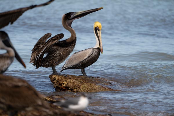 Tags: brown pelican, pelican, bird, wildlife, sea, ocean, rock, yellow head, long beak, plumage, water, nature, wildlife photography, coastal bird, marine life, seabird, avian, shore, natural habitat, animal, outdoors, environment, ornithology, birdwatching, coastal, aquatic bird, oceanic, wild bird, bird species, animal behavior, bird photography, sea life, marine bird