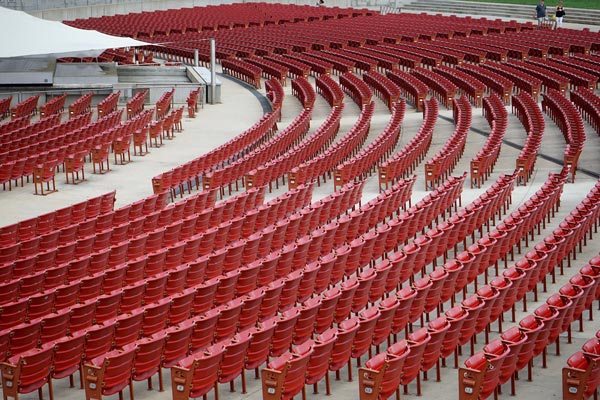 Tags: Jay Pritzker Pavilion, Chicago, outdoor concert venue, modern architecture, red seats, metallic structure, open-air setting, concert, event location, iconic landmark, Millennium Park, Frank Gehry design, cultural venue, performance space, amphitheater, urban park, architectural design, public space, music venue, city attraction, tourist destination, seating arrangement, stage, outdoor events, cultural events, Chicago landmark