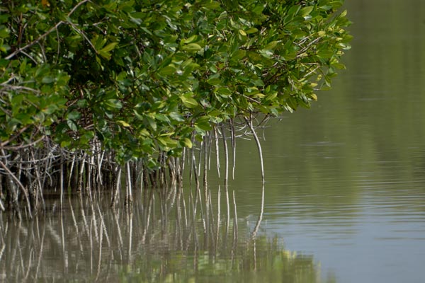 Beschreibung: Ein Reiher wird im Flug festgehalten, als er vom Rand eines Bootes abhebt. Die Szene spielt sich vor der Kulisse von Playa Chuburná ab, wobei üppiges Grün den Vogel teilweise verdeckt. Die Flügel des Reihers sind weit ausgebreitet und zeigen die komplizierten Federstrukturen.