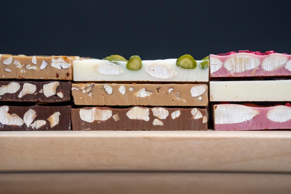 Stapel von verschiedenen Schokoladentafeln mit Nüssen